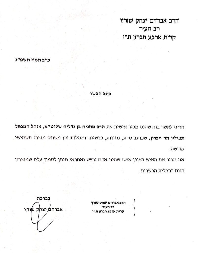 בהכשר רבני חברון וקרית ארבע הרה''ג דוב ליאור שליט''א והרה''ג אברהם יצחק שוורץ שליט''א.